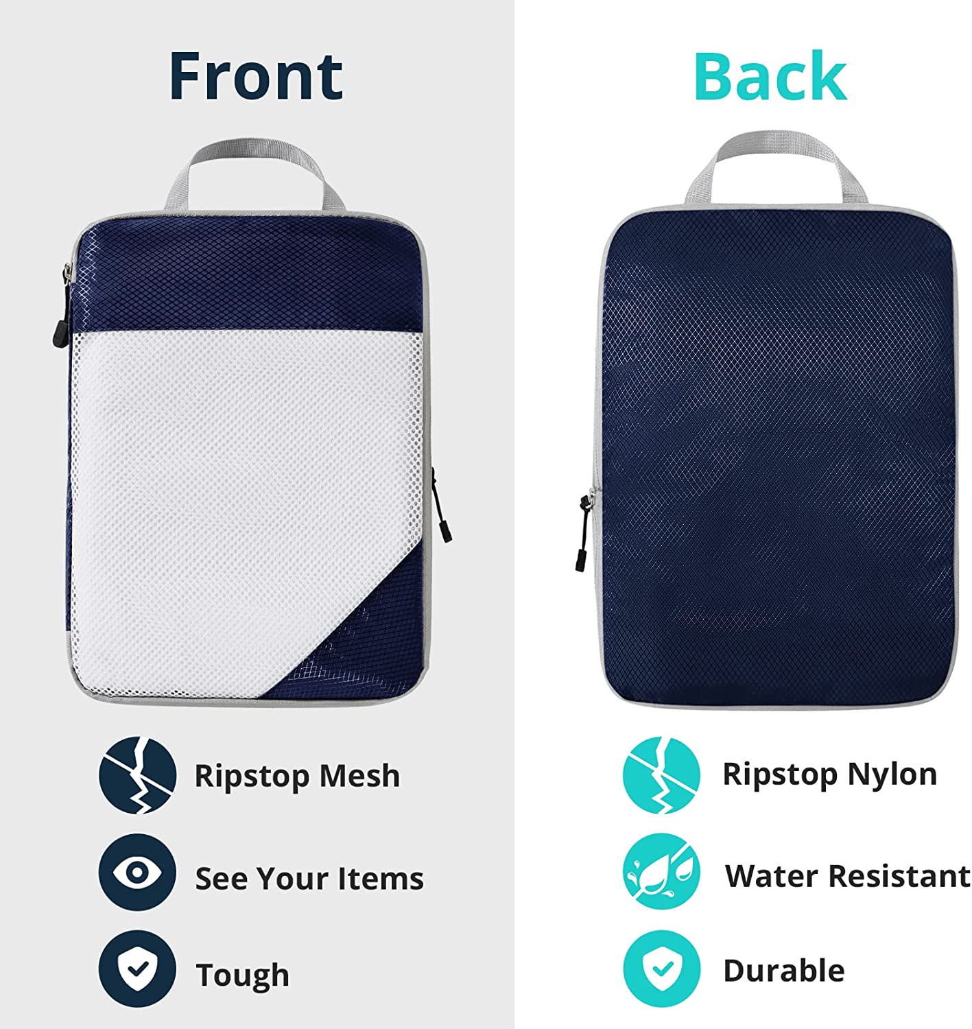• 600D NYLON FABRIC: These compressible luggage cubes are made of 600D ripstop nylon fabric, which is water-resistant, lightweight yet durable. Besides, the mesh top of each travel cube is reinforced with professionally done seams which ensures long-lasting usage.