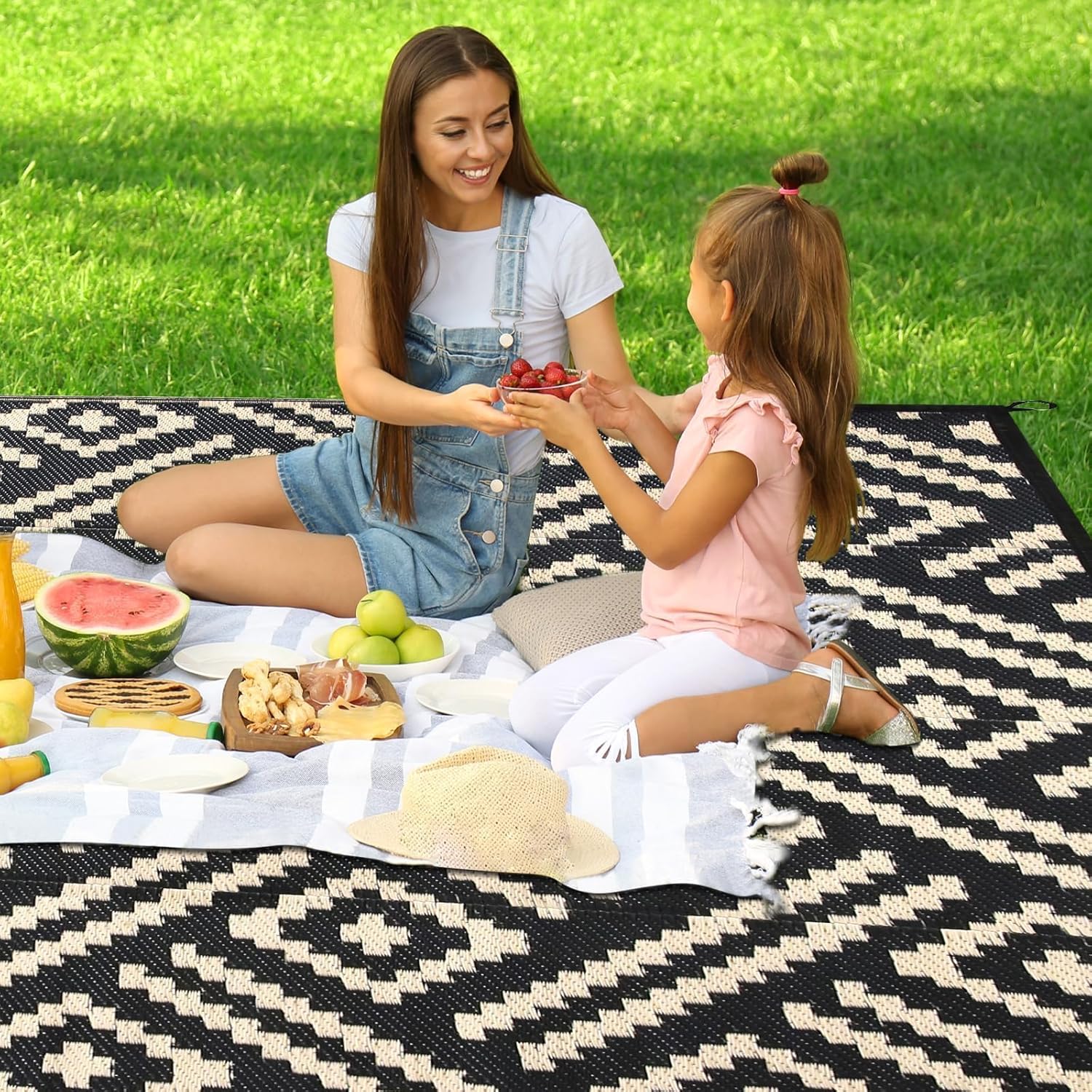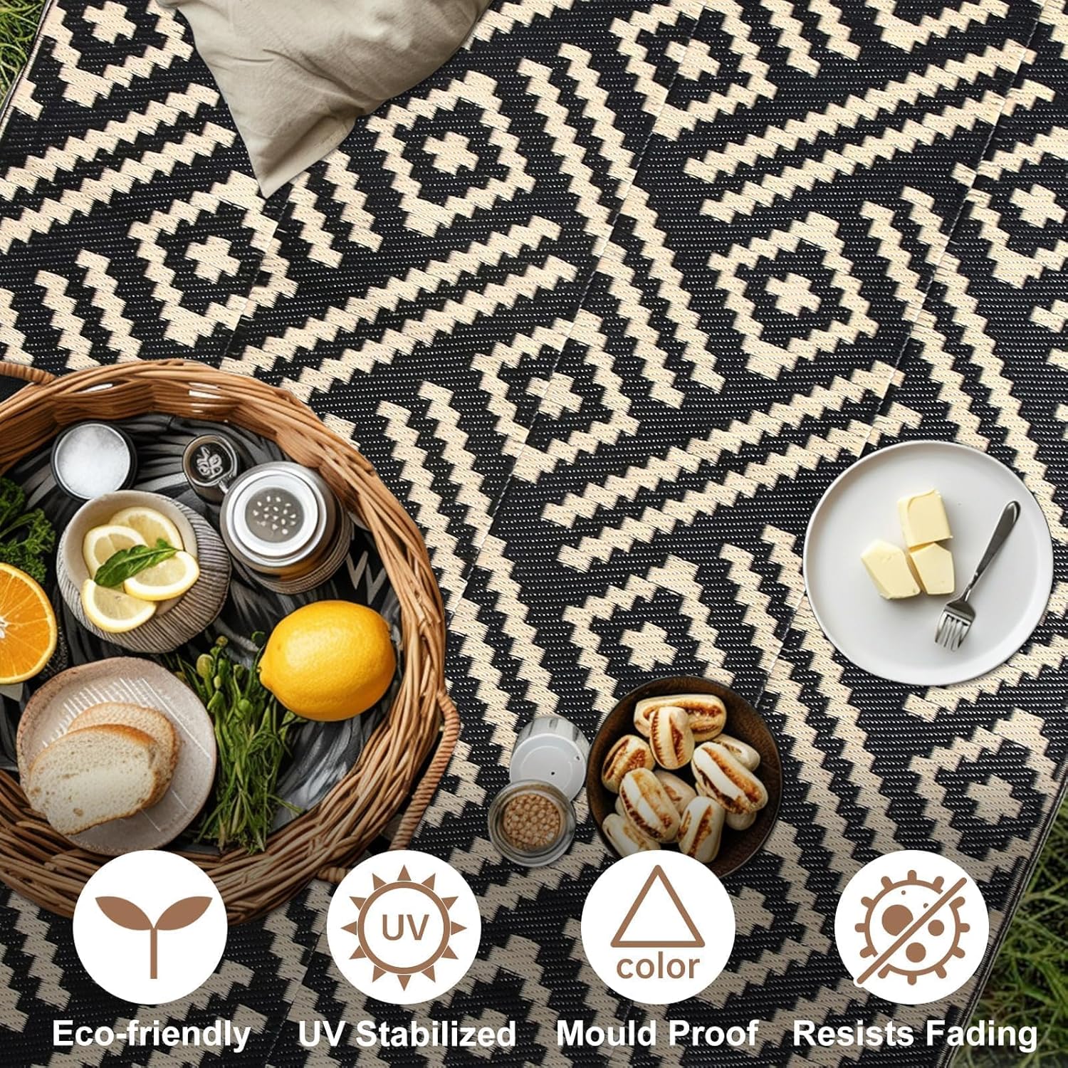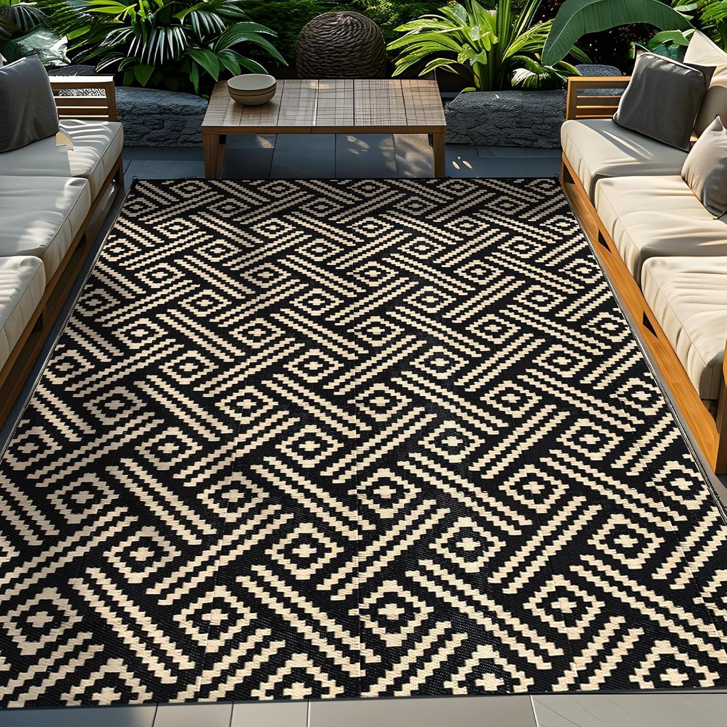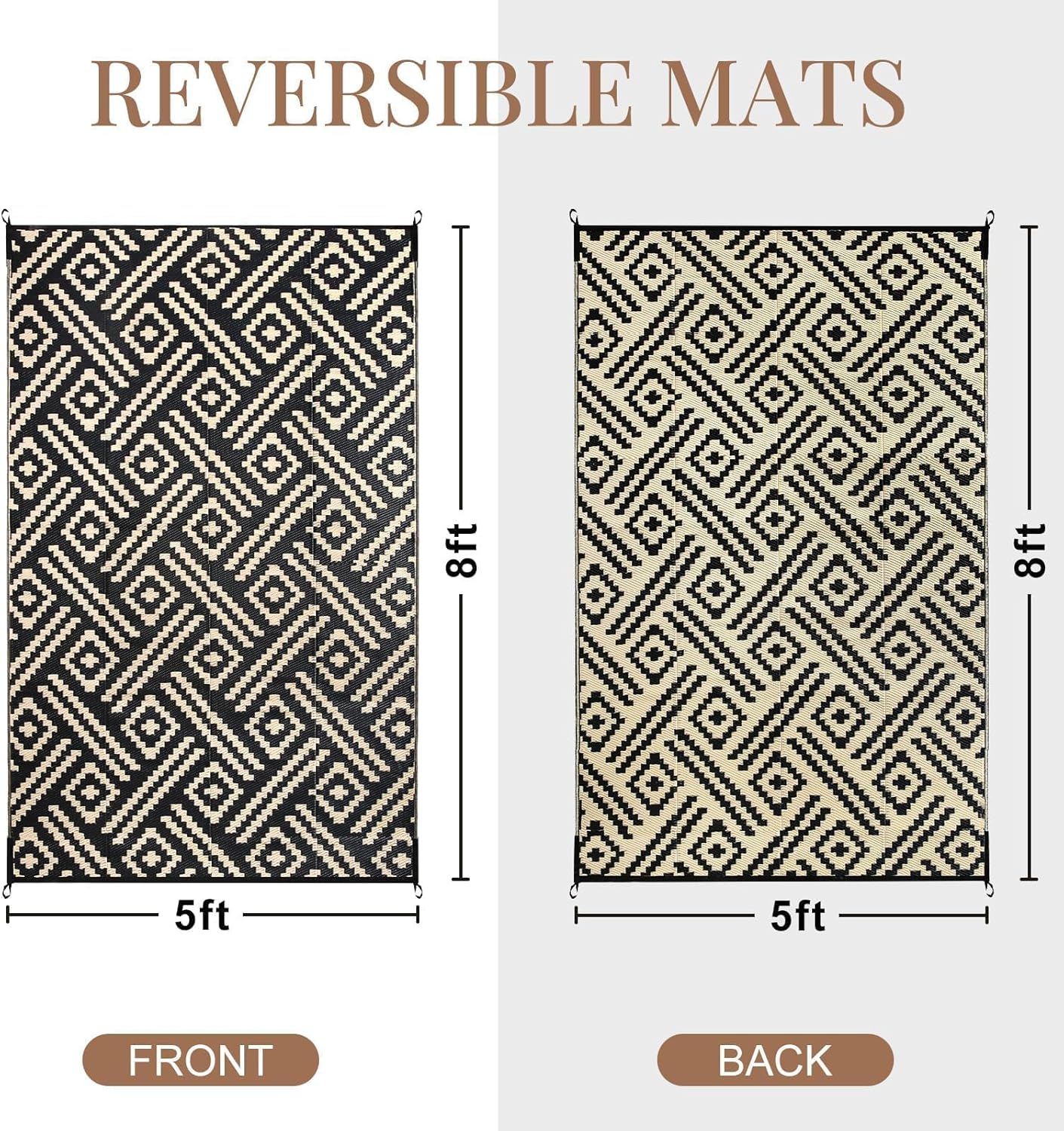 ROCYJULIN Plastic Straw Rug - 5x8 Ft, Waterproof Carpet for Patio, Camping, Rv, Balcony, Reversible, Black and Beige